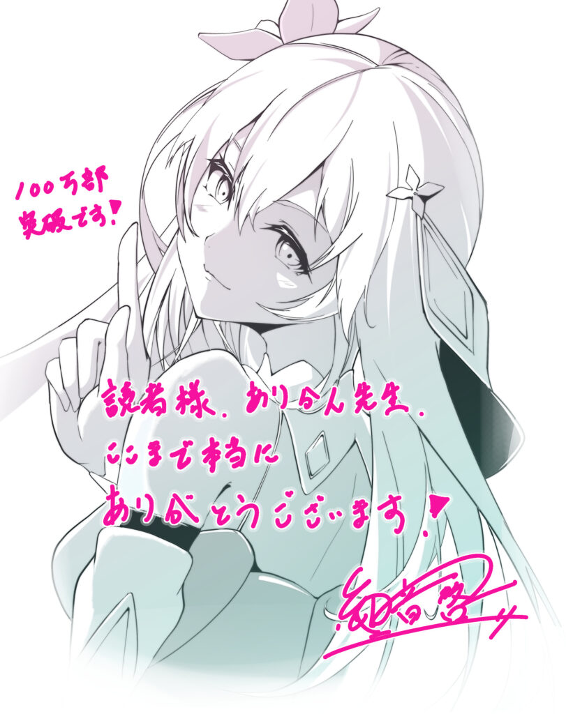 Sazane também agradeceu ao artista do mangá, Arikan-sensei, e aos leitores pelo apoio. A ilustração comemorativa que acompanha o post celebra a marca de 1 milhão de cópias ultrapassadas pela franquia.